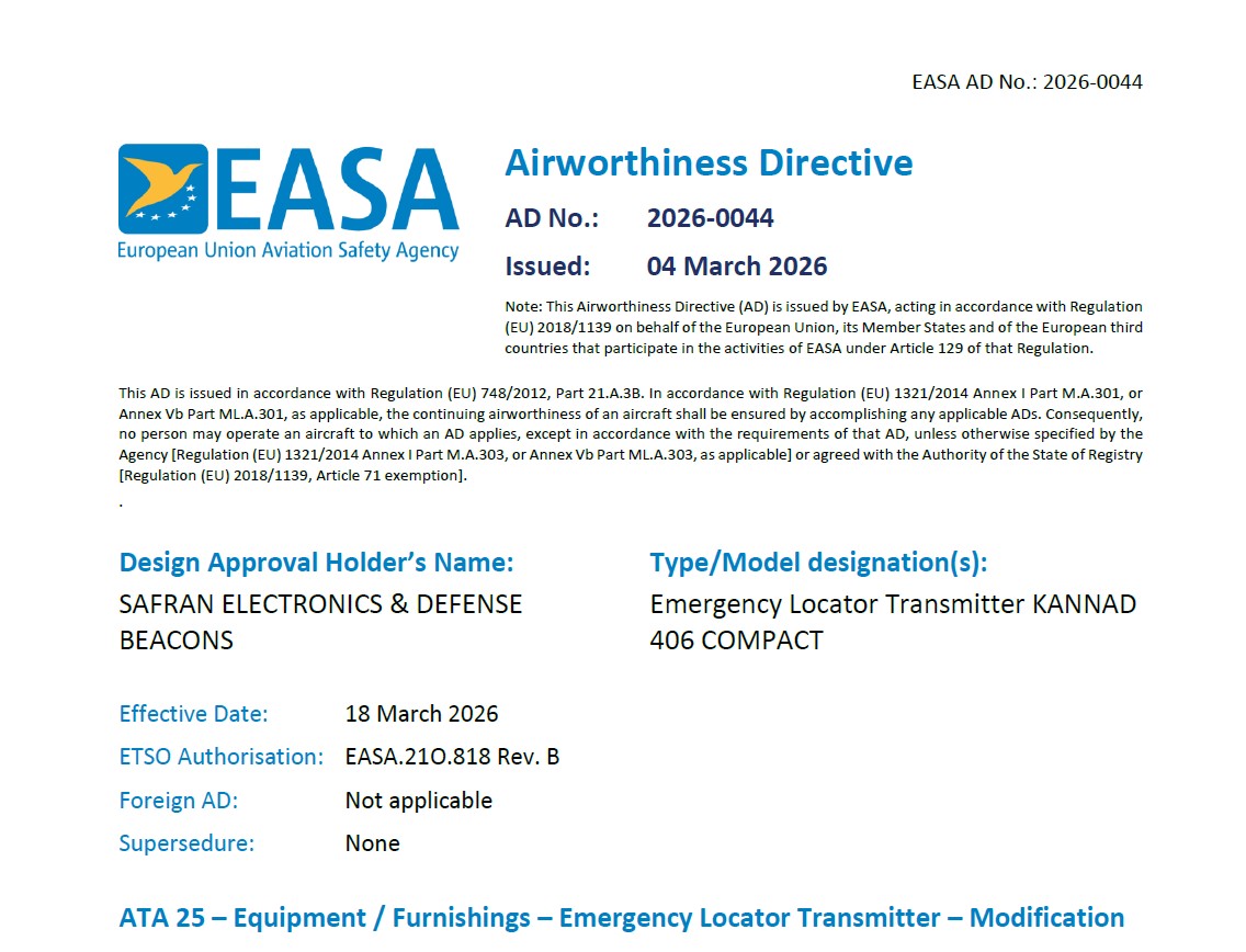 Safran Electronics & Defense Beacons SB S1840501-25-01 Revision 00 (original issue) dated 21 January 2026, required to be applied.